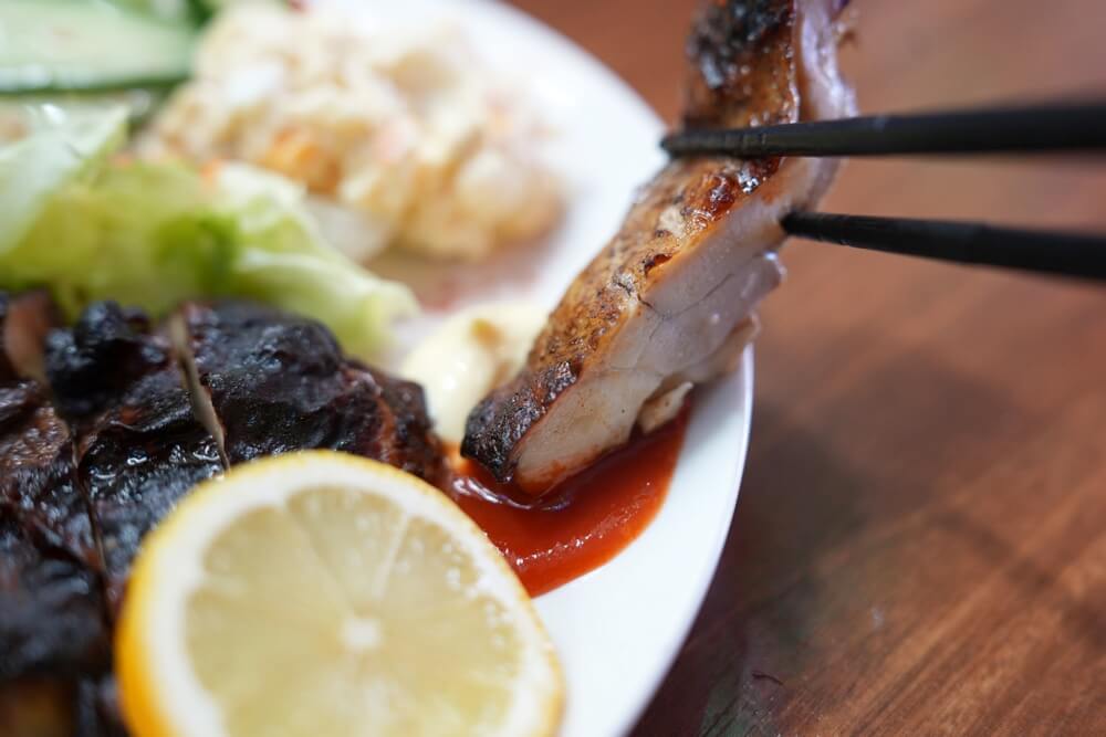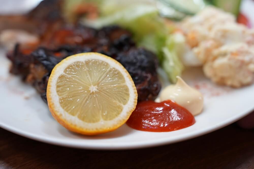付け合せのピリ辛ソース&マヨとレモン果汁を搾っていただきます。