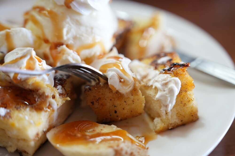 キャラメルソースがたっぷりで中央には冷たいバニラアイス