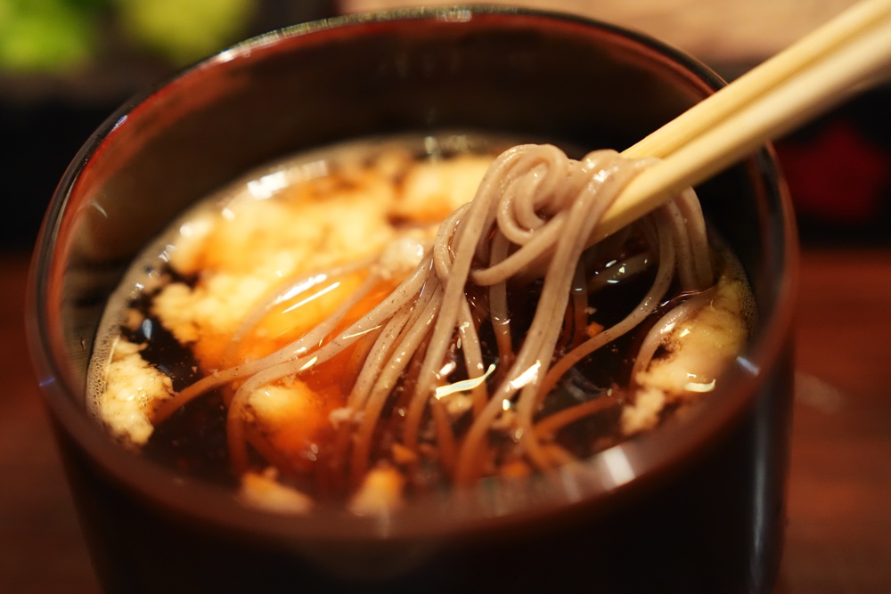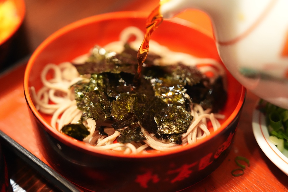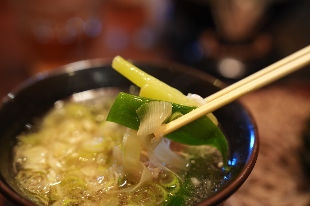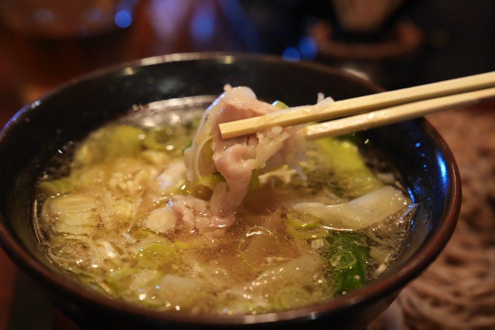 冷たいお蕎麦をこの熱々の黒豚だしにくぐらせていただきます。