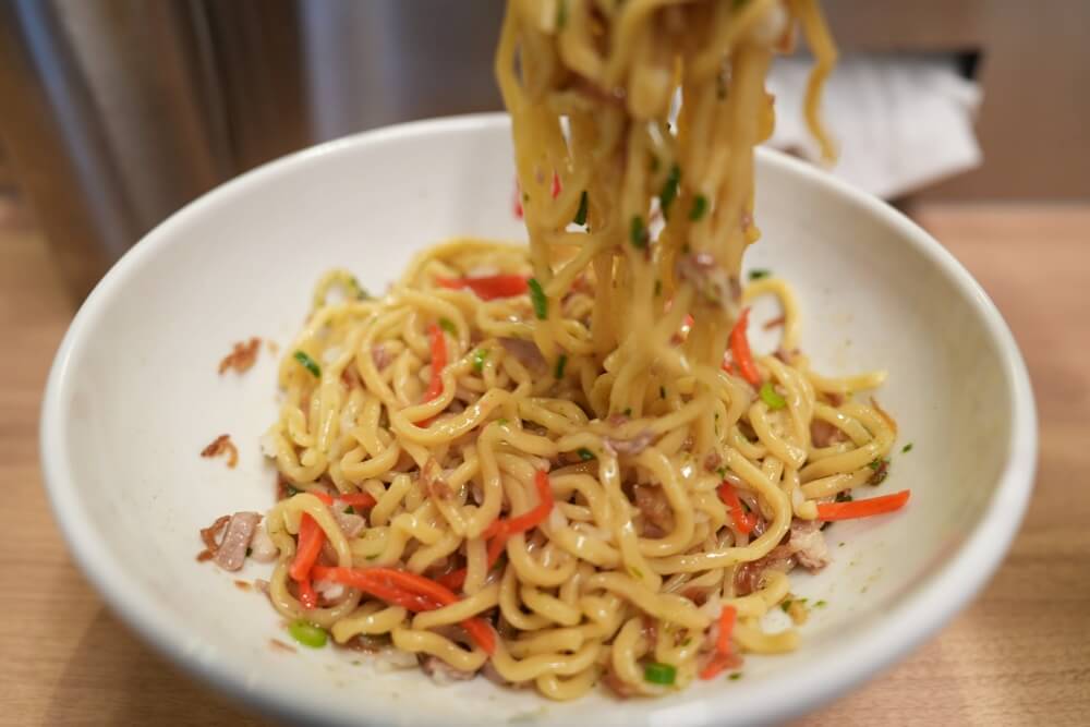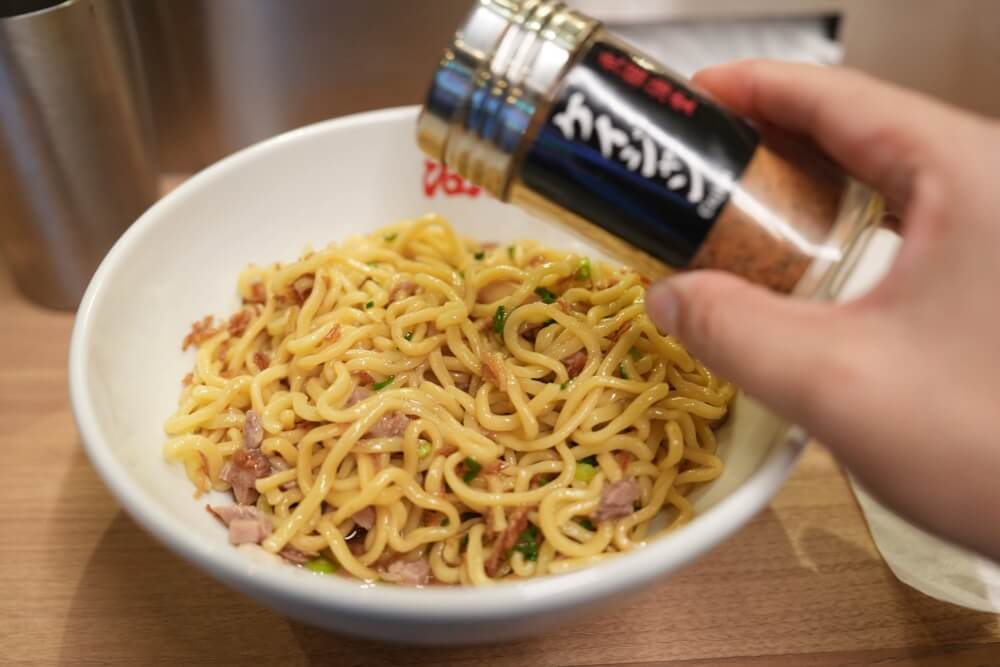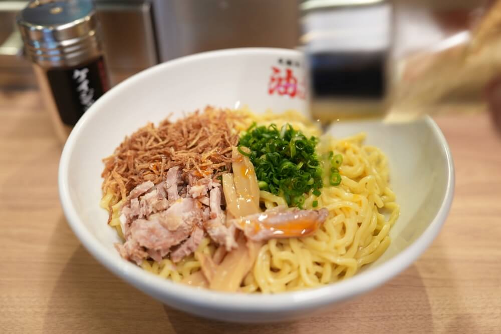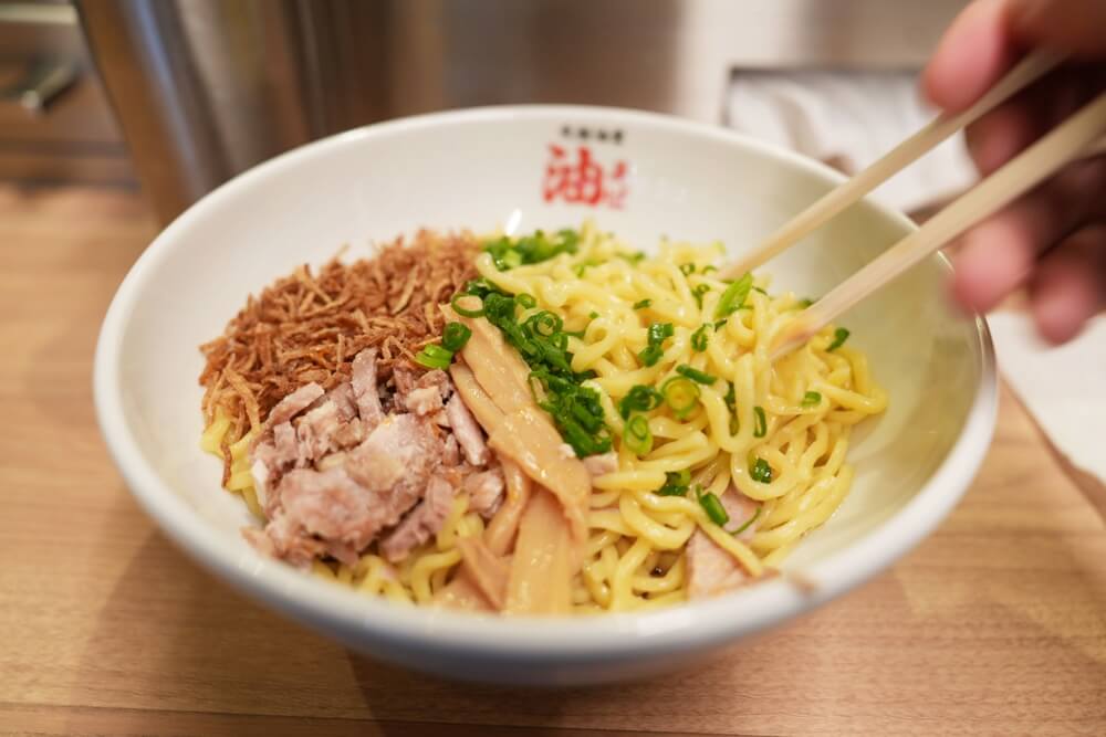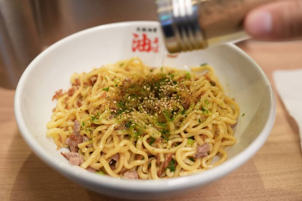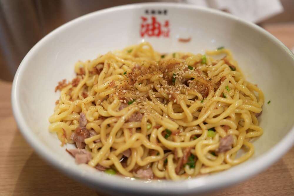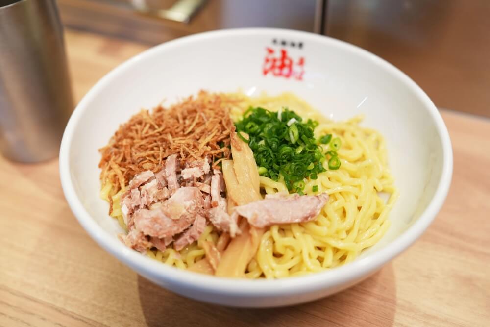 それではお待たせしました!こちらが元祖油堂の油そば(フライドオニオン追加)になります