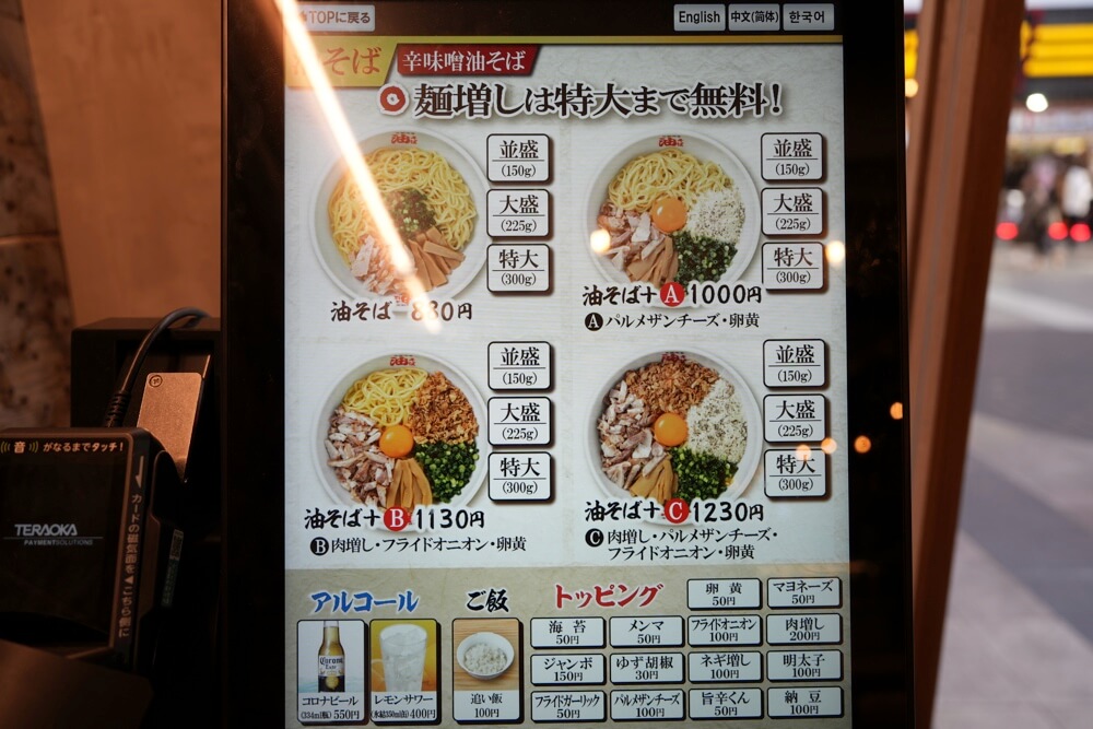 メニューはいたってシンプルで、ベーシックな油そばがあって、そこにA・B・Cとお店おすすめのトッピングセットがあるだけです。