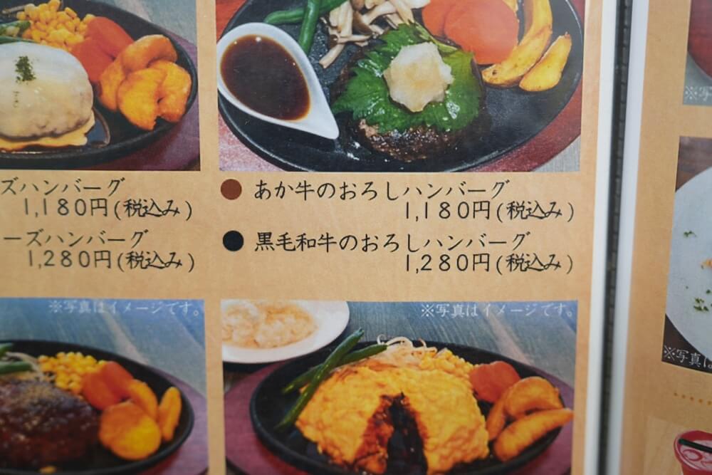 ハンバーグはよく見ると同じメニュー内でも「あか牛」or「黒毛和牛」が選べるってのがユニークですよね。