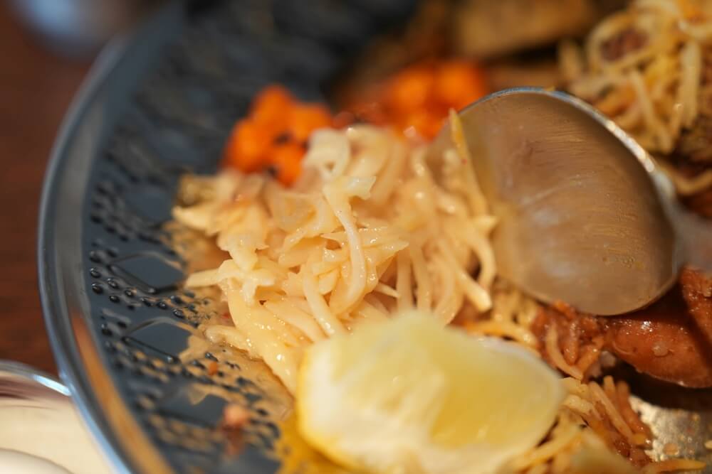 そこにこれまたスパイスで味付けされた副菜を好きに絡めていただきます。