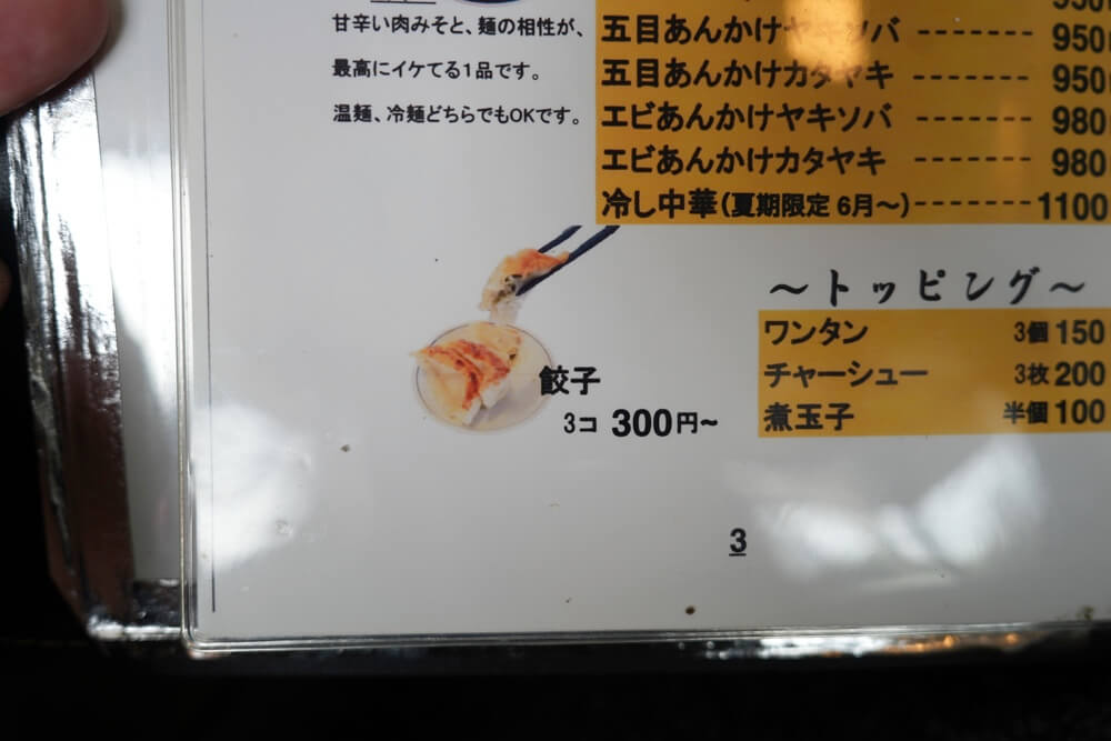 餃子はメニュー表の端に控えめに書いてあります。3個で300円からとなっていて、希望の個数で注文します。