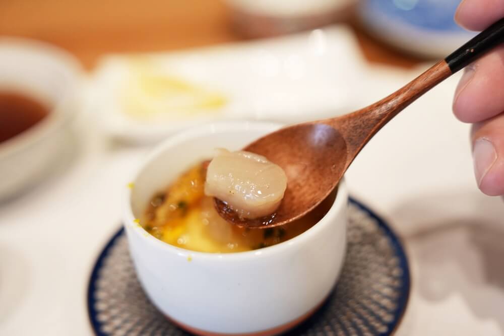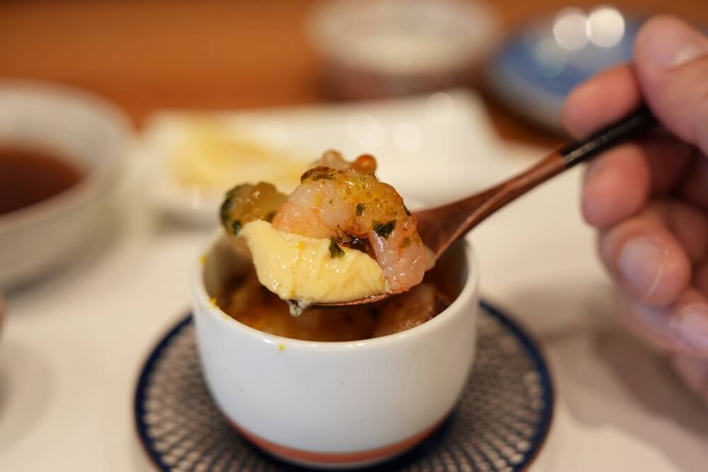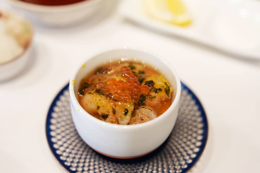 羽二重蒸しは茶碗蒸しのようなもので、その上にはイクラに海老やホタテなどの海鮮がどっさり。