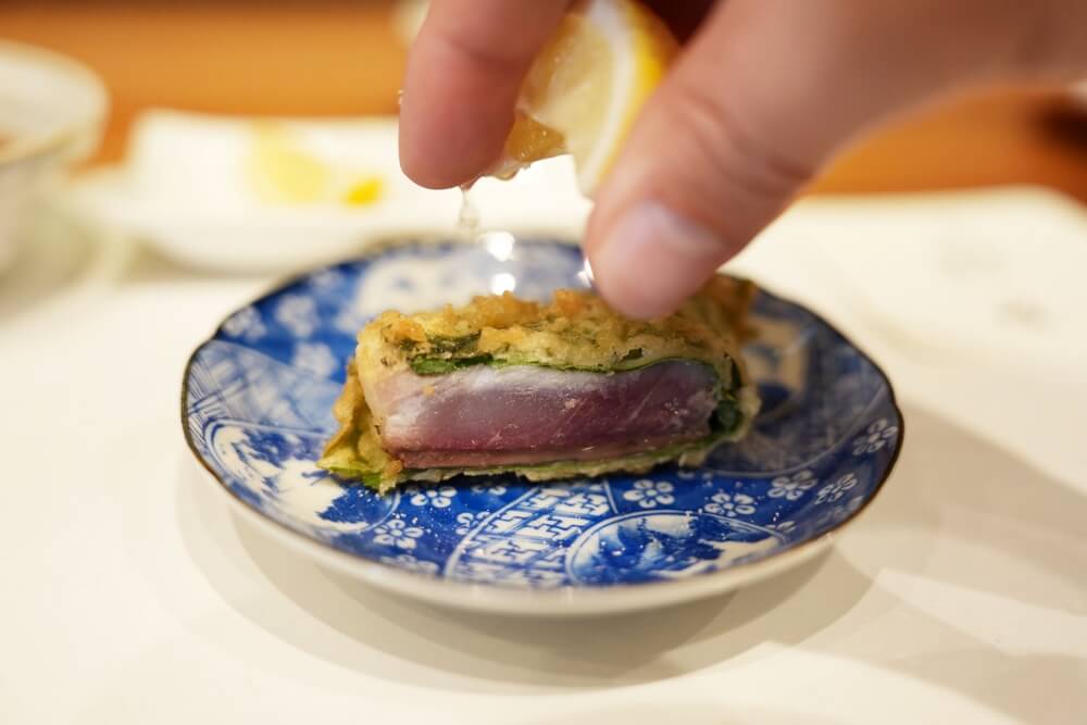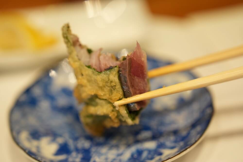 お刺身でも食べれるアジを大葉でくるっと巻いた一品。レモンと塩でいただきます。