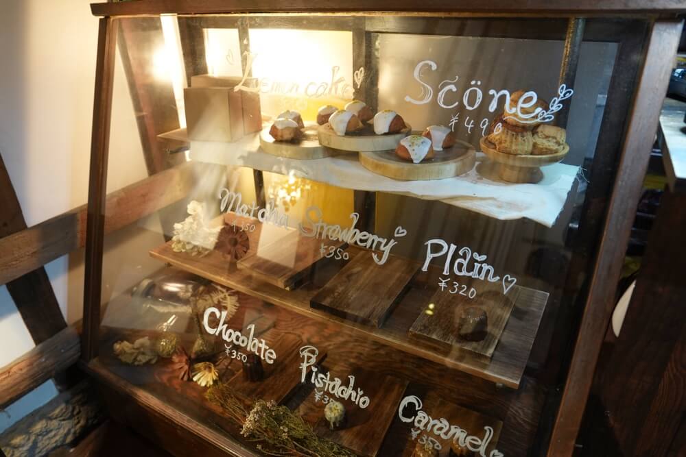 こちらのショーケースに並べられたカヌレやスコーンにレモンケーキをいただくことができます。