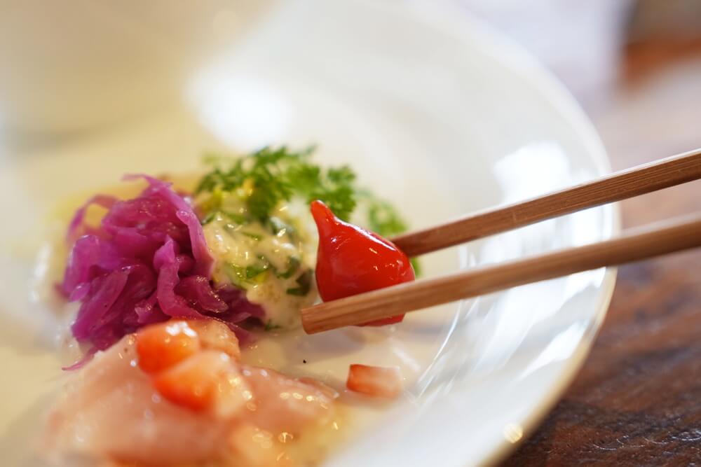 そしてお刺身のカルパッチョ的なやつなんですが、上には細かく刻んだ苺の実。