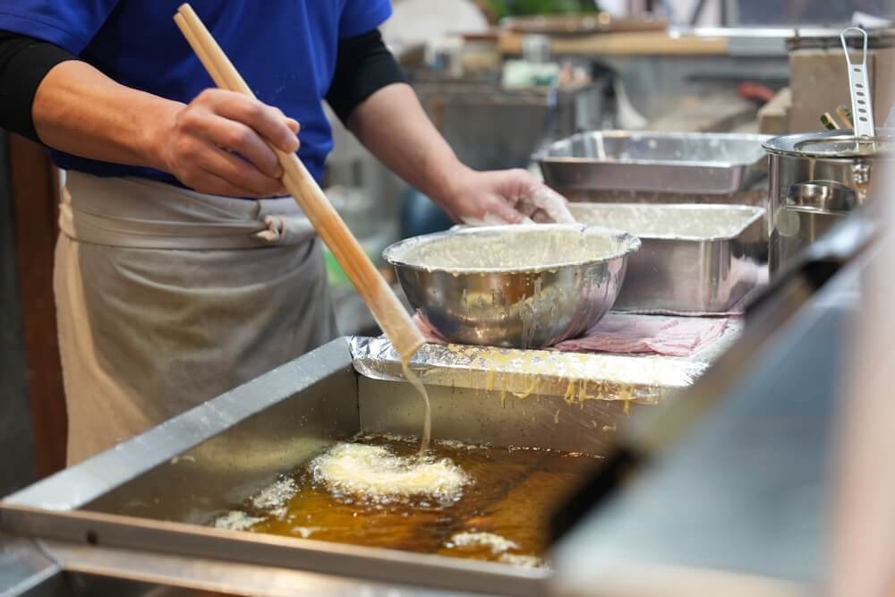 手前のカウンターのところで大将が天ぷらを揚げまくっています