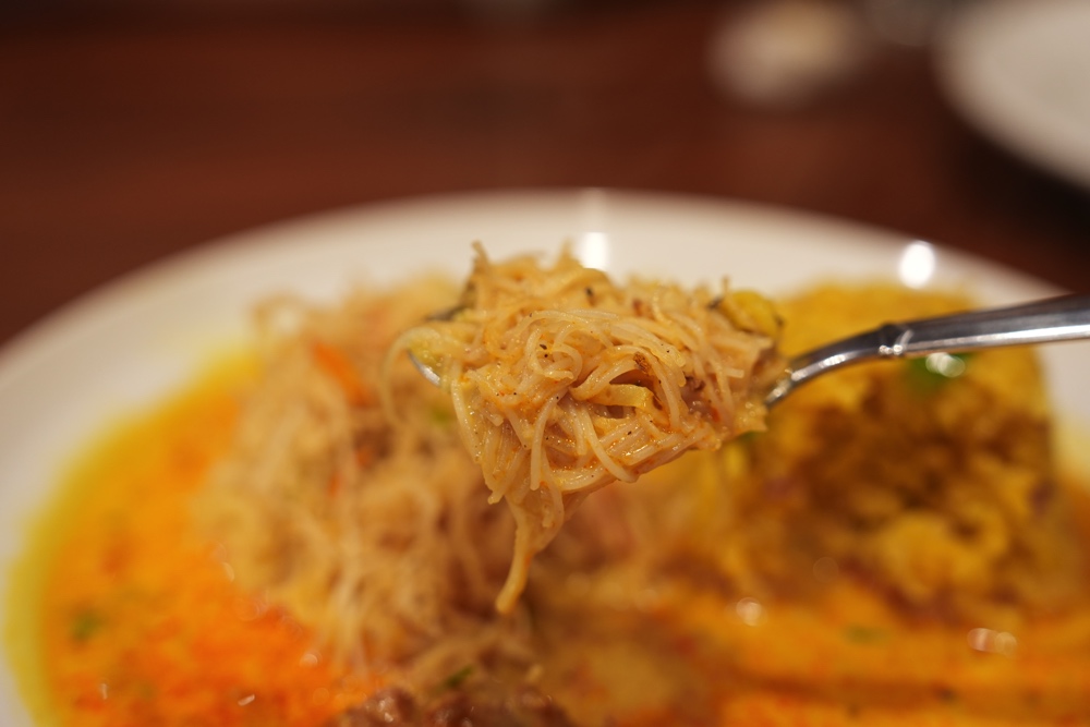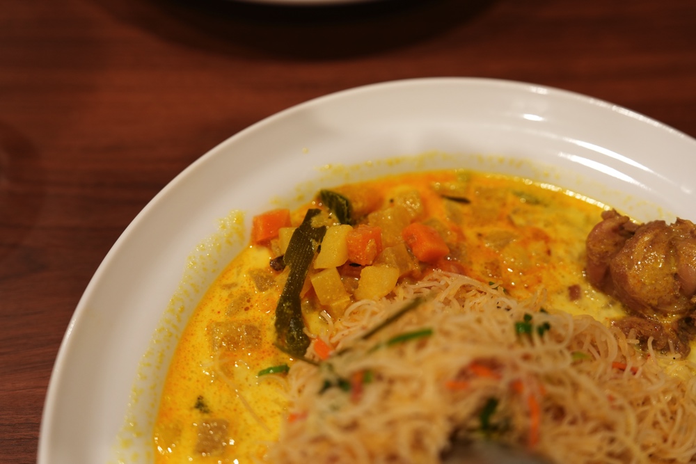 これをシャバシャバのココナッツミルクベースのカレーと和えまして、スプーンで勢いよく口に運びます。