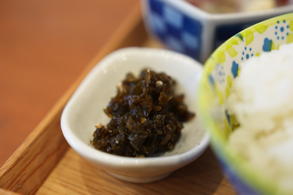 あと、セルフコーナーに昆布の佃煮が取り放題で置いてあって、これがまたごはんに合います。