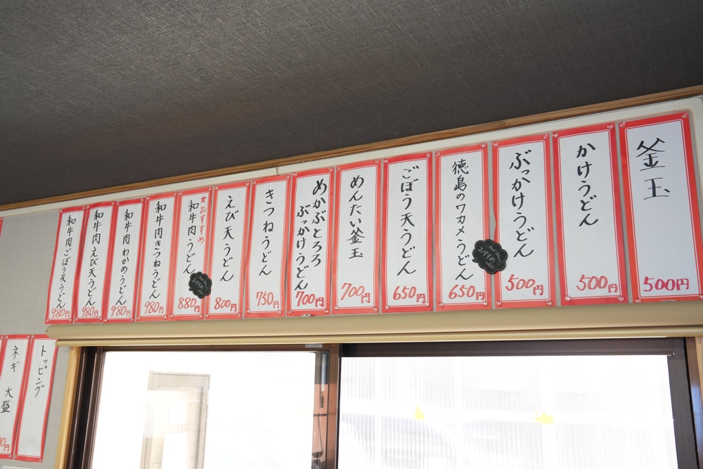 メニューは壁にずらりと貼られています。釜玉の500円から和牛肉ごぼう店うどんの980円までの価格帯です。