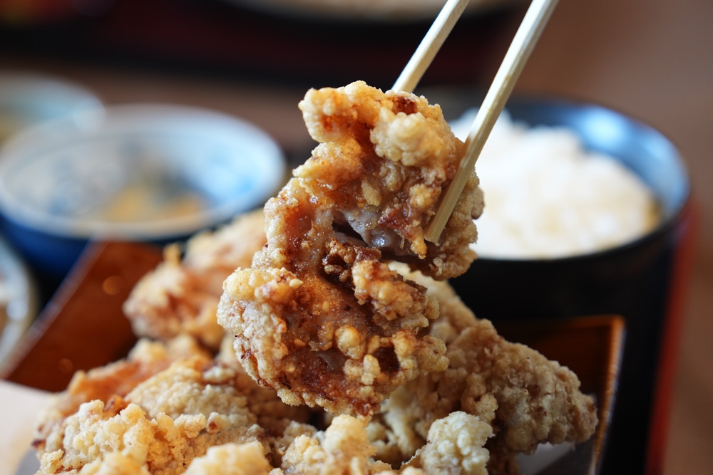 写真には写っていませんが、お昼時にはお客さんいっぱいで、皆さん唐揚げを頬張っています。