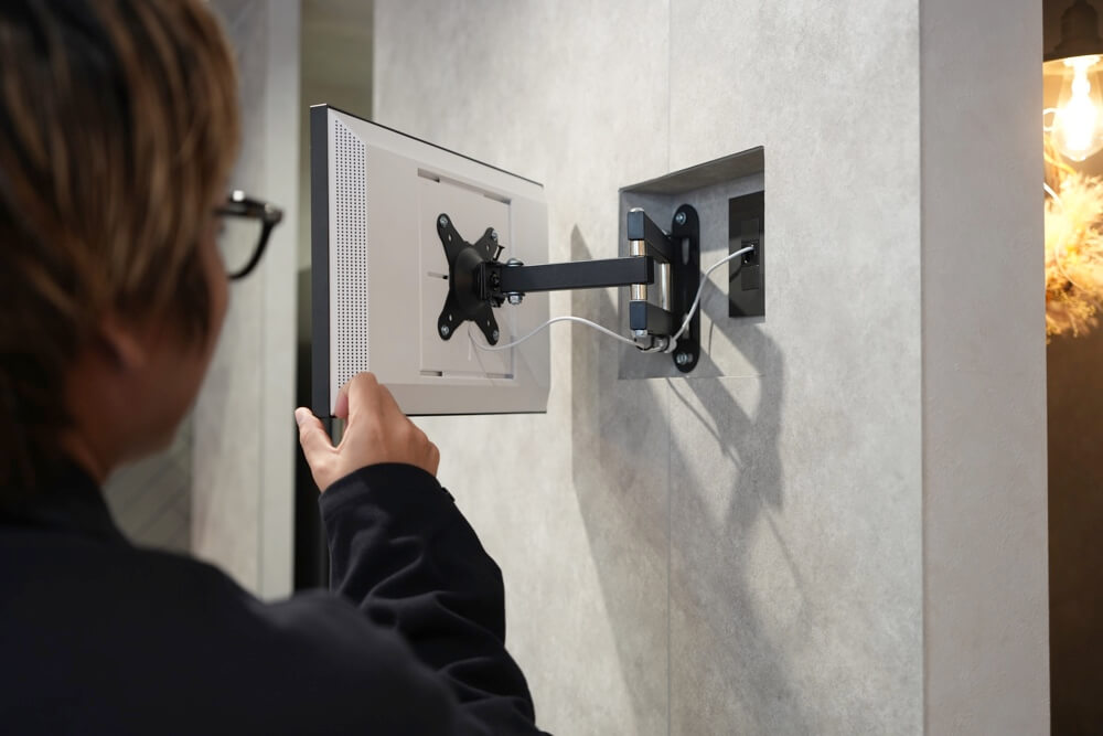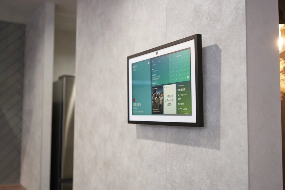 こうすることでキッチンからも見やすい角度にできて、通常時はスタイリッシュに壁に浮いているという。