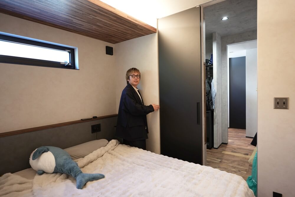 天井に間接照明が仕組まれた主寝室。起きたらすぐにファミリークローゼットにも抜けれる設計で、