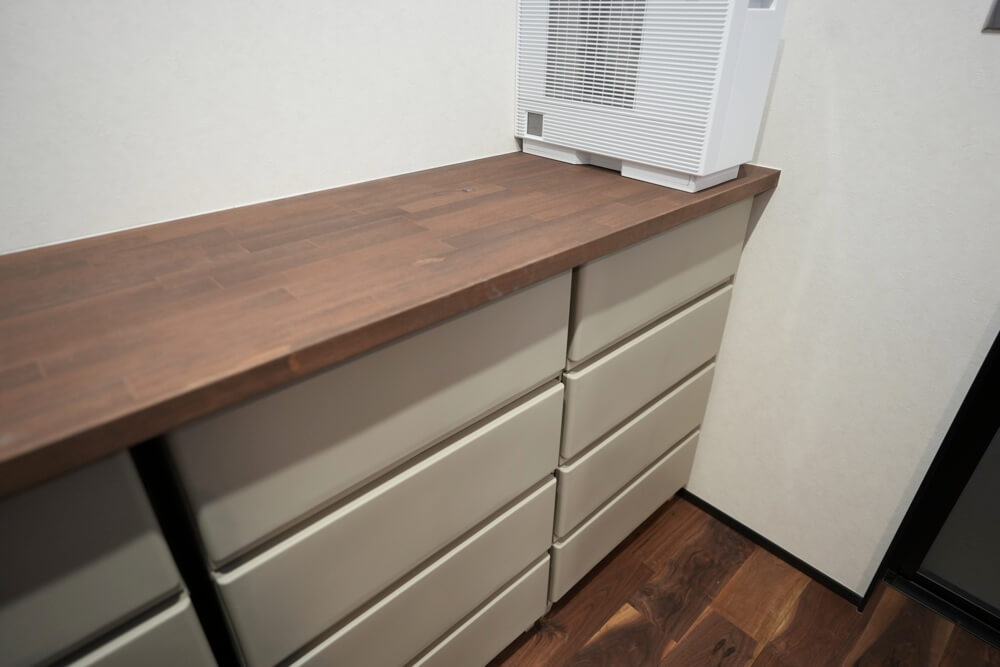 こうすることでシーズンごとにしか出さない寝具などを上に収納して、日常でよく使う衣類などを使いやすい高さにたくさん収納できるようにしています。