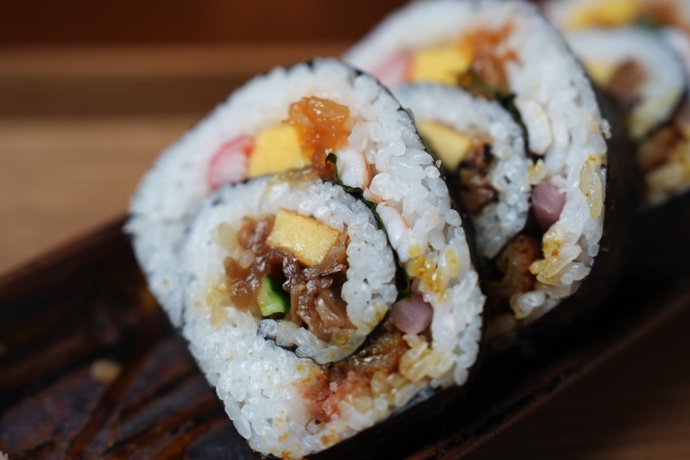 海苔を巻き込むようにロールしてありまして、中にはかんぴょうや玉子、穴子に椎茸などなど、