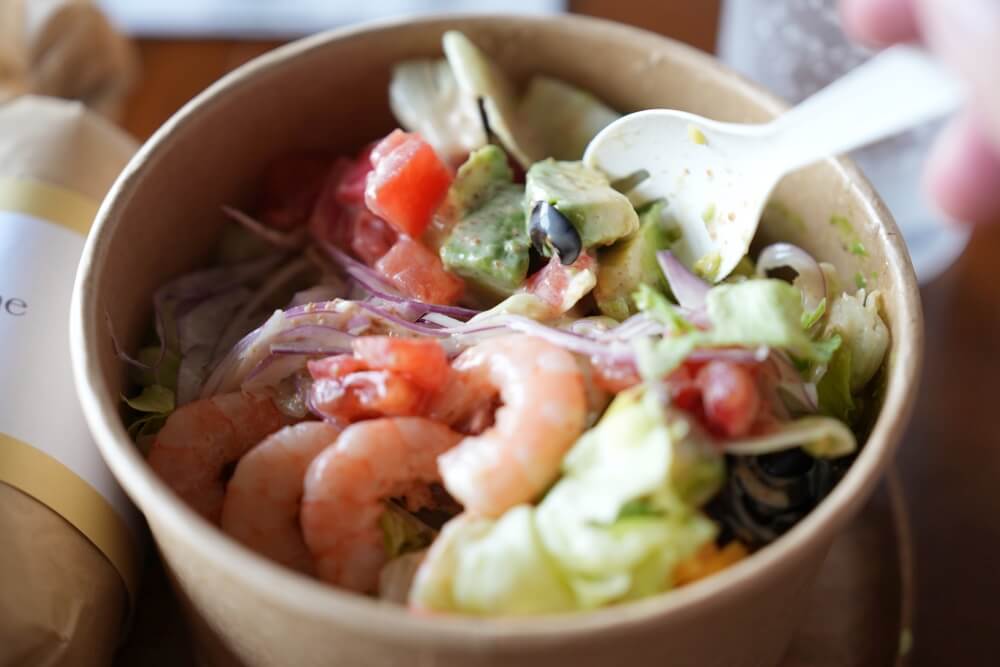 レタスベースに「紫たまねぎ、トマト、アボカド、ブラックオリーブ、チェダーチーズ、海老」が乗ります。