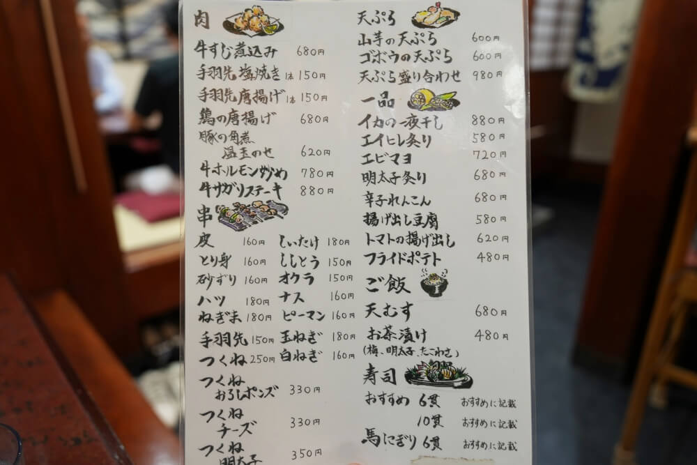焼き鳥に唐揚げ、牛ホルモン炒めや天ぷら、寿司といろいろなメニューがありますねぇ。