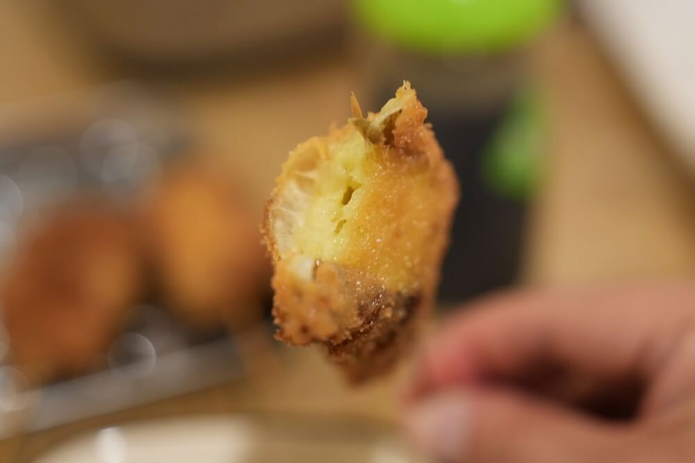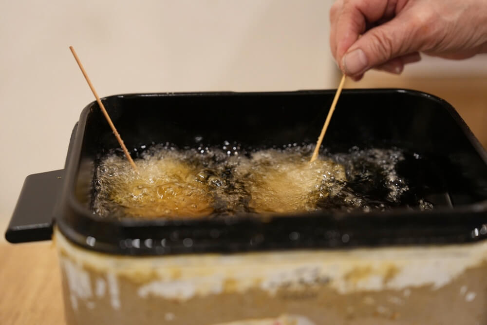 そしてテーブルの上には小さなフライヤーが設置されていて、目の前でお母さんが串揚げを作ってくれます。