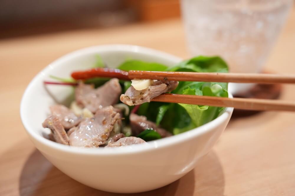 コリコリ食感の砂ズリに、にんにくオイルの食欲そそる香り。