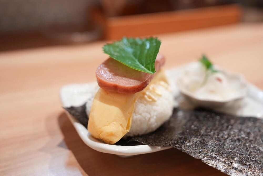 シメには奥様手作りのスパムおにぎり(玉子乗せ)